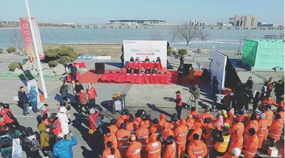 (荔波县文明办主任张春凤、爱卫办主任梁运珊、城市管理综合执法局副局长李世友致辞,并为环卫工人送上春节慰问品和保暖手套,献上热茶水,并于环卫工人参与趣味游戏,环卫工人可根据游戏自己选择参加,通过游戏将礼品送给桑德环卫工。)3.蚌埠分会场:安徽蚌埠淮河文化广场