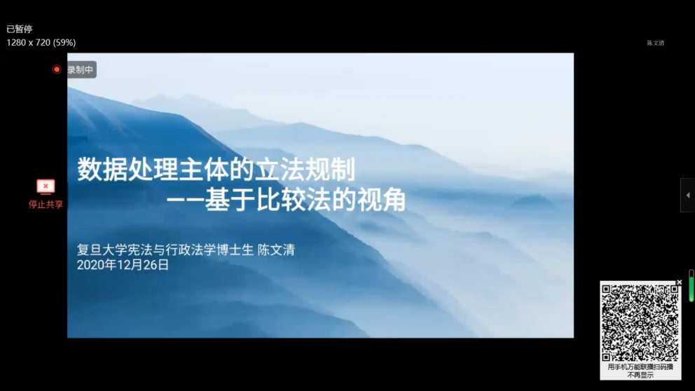 其五,国际经济行政法圆桌论坛副秘书长、复旦大学法学院陈文清博士就个人信息保护中数据处理主体的立法规制问题,从比较法的视角做了相关的研究分享。首先,在数据保护的立法现状上,过去我国直接对个人信息加以保护的全国性法律比较有限,《民法典》以及《数据安全法》、《个人信息保护法》的制定使得关于个人信息的立法保护有了显著的进步与突破。其次,在数据处理主体的立法规制模式上,陈文清博士总结了当前的四种模式,其中欧盟GDPR采取的是划分为控制者与处理者的二元划分模式。并指出,2020年《个人信息保护法(草案)》借鉴国际规则引入了处理者的概念,直接在第二章对个人信息处理者做了统一规制。随后,报告进一步介绍了欧盟GDPR中数据处理主体二分法的建构逻辑。第一是代理、合同等民事法律制度的有效引入,第二是数据保护立法特征与目的的切实遵循,第三是权责一致原则的立法凸显,第四是数据处理、监管与救济程序的高度协调。最后,对2020年草案有关数据处理主体法律规则中的进步与不足之处进行了总结,并提出了两种可以考虑的修改与完善路径。