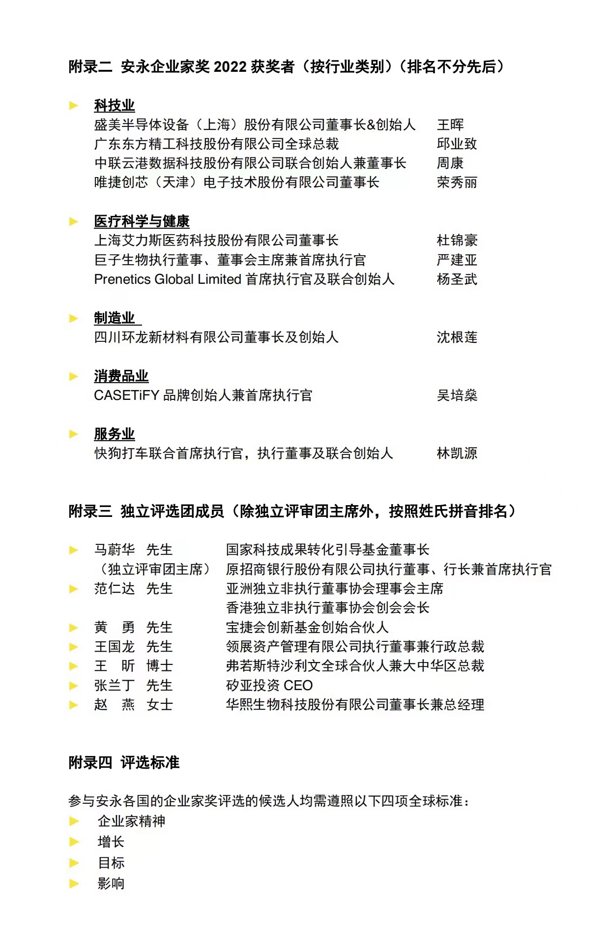 2022年12月13日,安永早前揭晓“安永企业家奖2022”获奖者名单(见附录一及二),盛美半导体设备(上海)股份有限公司董事长及创始人王晖和快狗打车联合首席执行官,执行董事及联合创始人林凯源分别荣膺安永企业家奖2022中国内地和中国香港/澳门大奖,以表彰他们锐意进取、勇于创新的企业家精神,在这个转型时代下引领商业之美和产业之变,为经济高质量发展注入更多创新活力。本次评选历时近六个月,最终十位杰出企业家脱颖而出,获此殊荣。今年的评选活动以“激发活力,融通创新”为主题,旨在发掘和表彰为打造协同高效、融通合作的创新生态做出显著贡献的企业家,通过共创共享、良性共生、协同发展的方式持续创造长期价值,进一步激发中国企业活力,为中国企业家精神书写新的时代内涵。