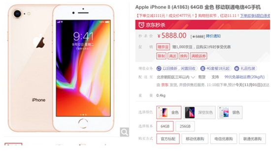 iPhone 8是苹果于2017年秋季推出的智能手机,属于iPhone 7的常规更新型号,主要的升级是处理器、摄像头CMOS以及机身材质的改进。采用双面玻璃机身,官方提供了金色、银色以及深空灰配色。其他参数与iPhone 7相比差别不大,保持4.7英寸大小与IP67级别的防尘防水能力,这个尺寸可以轻松放入口袋,在视觉效果与单手持握上达到一个相对的评论,适合喜欢小屏的用户作为主力机使用。这款机型的64GB版本上市价格为5888元,但目前在京东下单直降1111元,最终可做到4777元到手价。要知道,这款产品香港的售价也为5988港元,约合人民币5007元,如此一来iPhone 8的国行价格已经低于港版价。此外,不止iPhone 8,连iPhone 8 Plus在京东的最终价格也同样低于港版价格,可以说是非常值得入手。