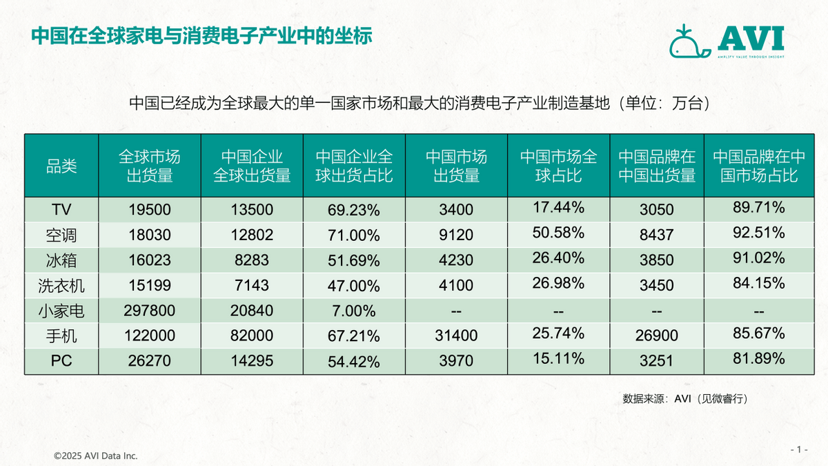 中国作为全球最大的单一国家市场和最大的消费电子产业制造基地,在出货量上占据显著优势,并在技术创新、产业升级以及品牌建设方面取得了令人瞩目的成就。以电视、空调、冰箱、洗衣机等主要品类为例,中国企业在全球市场上的表现尤为突出。据AVI Data 数据显示,2025年全球电视机市场出货量为19.5亿台,其中中国企业贡献了13.5亿台,占比高达69.23%。而在空调领域,中国企业全球出货量更是达到了12802万台,占全球总量的71%,显示出强大的竞争力。此外,手机、PC等消费电子产品也在中国企业的推动下不断刷新纪录,成为全球市场的重要力量。