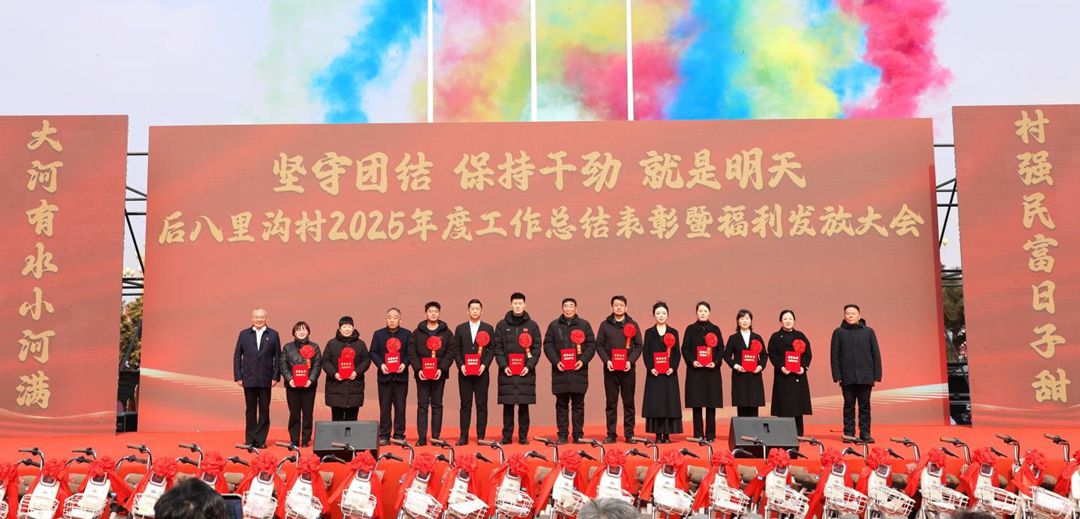 2月10日,山东省邹城市后八里沟村2025年度工作总结表彰暨福利发放大会盛大启幕,大会以“坚守团结・保持干劲・就是明天”为核心主题,后八里沟村全体村民、鑫琦集团全体员工欢聚一堂,共同回望 2025年攻坚克难的奋斗征程,表彰先进典型,擘画新年发展蓝图,现场暖意融融、气氛热烈,满溢着奋进与团圆的浓厚氛围。