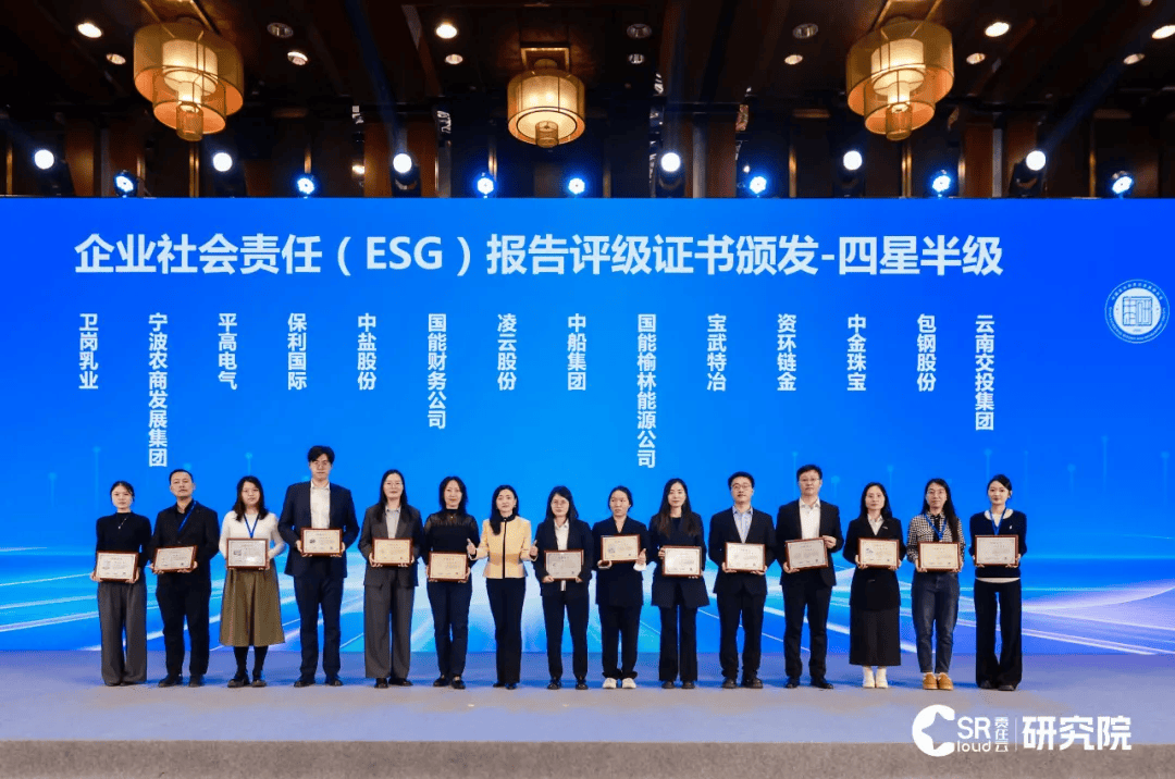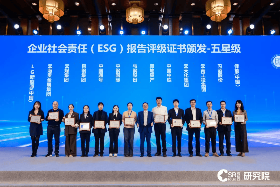 会议还举行了“企业社会责任(ESG)报告评级证书颁发仪式”,55家企业代表参会并获颁评级证书。中船集团、凌云股份、国能榆林能源公司、国能财务公司、宝武特冶、中盐股份、资环链金、保利国际、中金珠宝、平高电气、包钢股份、宁波农商发展集团、云南交投集团、卫岗乳业14家企业获颁“四星半级”报告证书。中国航发、中国海油集团、三峡集团、哈电集团、中国东航、通用技术集团、中国南水北调集团、中智集团、中国黄金集团、北方国际、北方矿业、国电南瑞、国能(天津)港务、马钢股份、中钢国际、宝地资产、中国通号、中国中铁、包钢集团、云天化集团、云煤集团、云南工投集团、云南贵金属集团、习酒股份、LG新能源(中国)、佳能(中国)26家企业获颁“五星级”报告证书。中国兵器工业、国家电网、中国大唐、中国电信、中国物流、宝武资源、茅台集团、云南能投集团、SK集团、中国三星、江苏悦达起亚、松下电器、中国浦项、现代汽车、乐金电子(中国)15家企业获颁“五星佳级”报告证书。