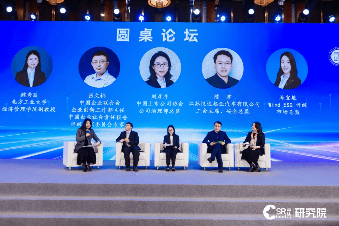 圆桌论坛环节,中国企业联合会企业创新工作部主任、中国企业社会责任报告评级专家委员会专家张文彬,中国上市公司协会公司治理部总监刘彦沣,江苏悦达起亚汽车有限公司工会主席、安全总监陈君,Wind ESG 评级市场总监海宜敏4位嘉宾围绕如何让可持续发展报告从合规工具成为传递价值的核心载体展开探讨,为中国企业提升可持续信披质量提供了借鉴和参考。