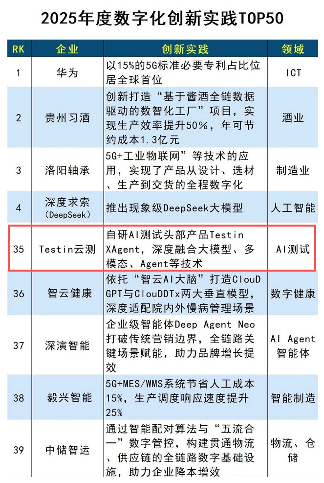 AI测试之光!Testin XAgent入选“2025年度数字化创新实践TOP50”