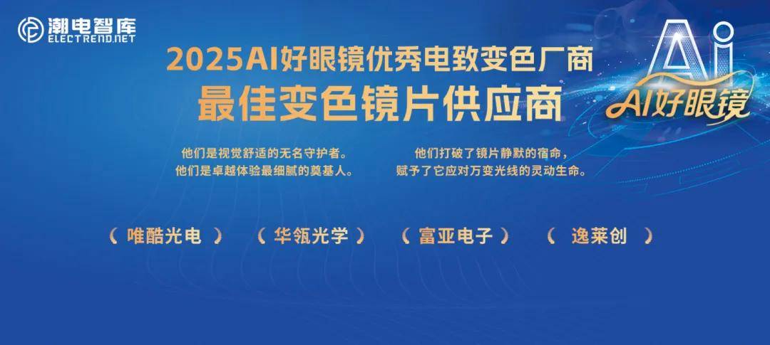 最佳变色镜片供应商获奖企业:唯酷光电、华瓴光学、富亚电子、逸莱创。