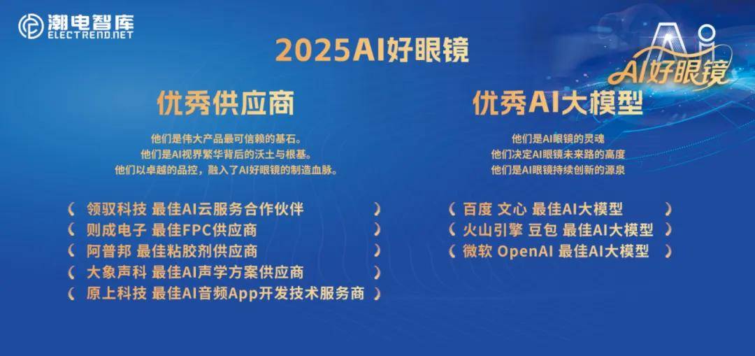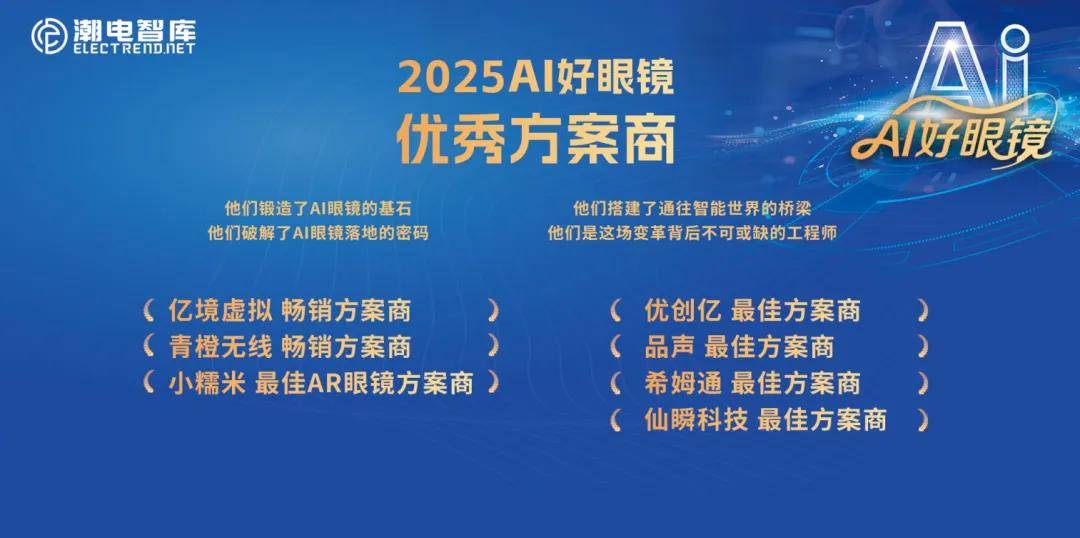 所有奖项主要综合产品实际销量、技术产业化能力、企业经营表现、市场竞争力、行业发展示范意义等多项核心指标评选而出,其中包括AI好眼镜先知奖、优秀设备厂商、优秀供应商、优秀AI大模型、优秀光波导厂商、优秀芯片厂商、优秀方案集成商、优秀光机厂商、优秀渠道商、优秀品牌商等奖项,这是对过去一年行业成果的集中检阅,也是对勇于开拓、持续创新并实现高质量发展的优秀产业伙伴的表彰。
