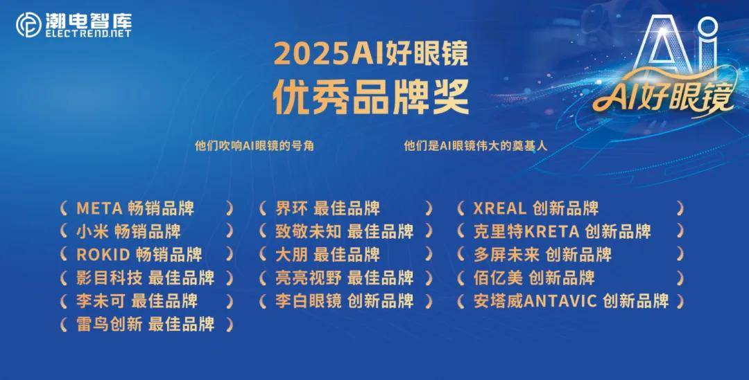 优秀品牌奖获奖企业:META(畅销品牌)、小米(畅销品牌)、Rokid(畅销品牌)、影目科技(最佳品牌)、李未可(最佳品牌)、雷鸟创新(最佳品牌)、界环(最佳品牌)、致敬未知(最佳品牌)、大朋(最佳品牌)、亮亮视野(最佳品牌)、李白眼镜(创新品牌)、XREAL(创新品牌)、克里特KRETA(创新品牌)、多屏未来(创新品牌)、佰亿美(创新品牌)、安塔威(创新品牌)。