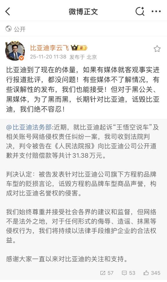 近日,比亚迪起诉自媒体账号王悟空说车及相关主体网络侵权责任纠纷一案尘埃落定,以法律捍卫声誉。11 月 20 日,比亚迪法务部发布公告披露,法院经审理认定,被告发表针对比亚迪...