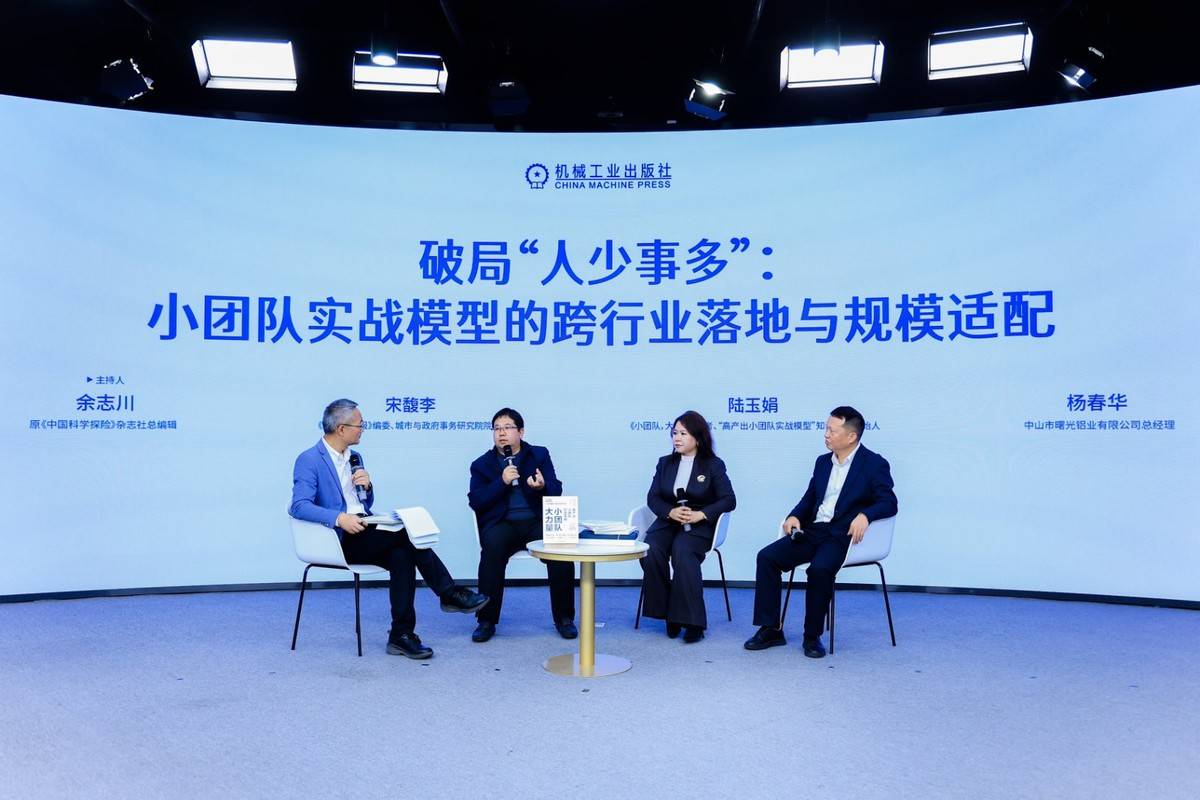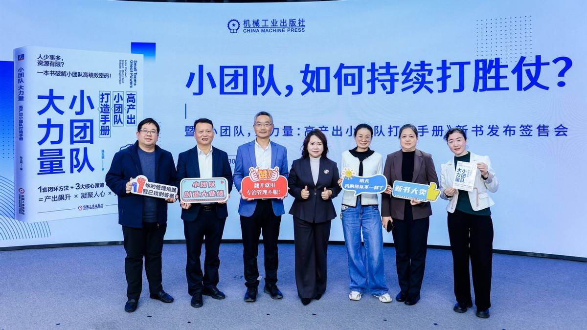 2025年10月30日,"小团队,如何持续打胜仗?——《小团队,大力量:高产出小团队打造手册》新书发布会"在机械工业出版社融媒体中心成功举办。本次活动汇聚了该书作者陆玉娟、制造业实战专家杨春华、资深媒体人余志川、《经济观察报》编委宋馥李等跨界嘉宾,通过新浪新闻、一刻Talks、嘉宾商学院、前沿认知、机械工业出版社官方微博、知更图书馆等媒体平台同步直播,累计观看量超过10万人次,引发广泛关注。