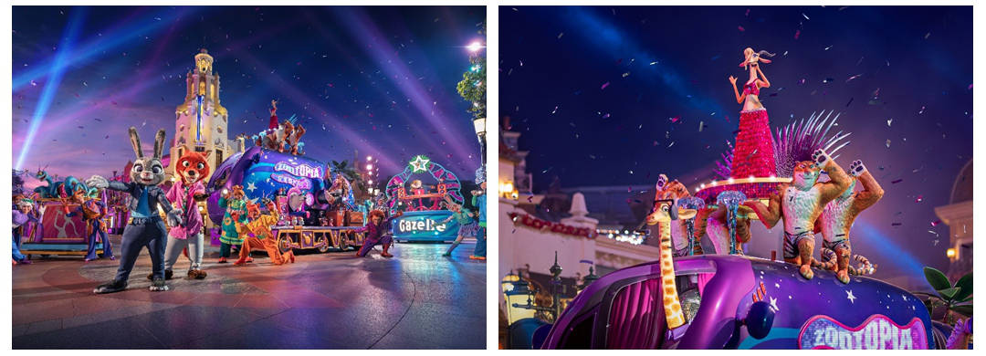 疯狂动物城花车为“米奇童话专列”注入全新活力,邀请游客在跃动的旋律下跟随朱迪、尼克等一众动物城居民尽情摇摆,点燃全场氛围