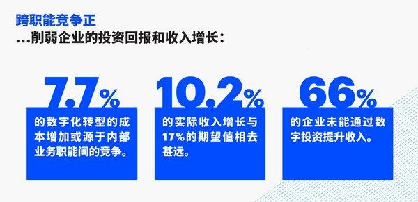 研究表明,缺乏跨部门协作的行为,诸如企业内部对某些技术进行重复投资,会使企业付出巨大代价。受访中国企业高管预计,内部的竞争会造成数字化转型的成本增加7.7%。企业领导者希望通过数字化投资使企业收入每年增长17%。但是,2017至2019年间,实际年均增收幅度仅为10.2%。同时,有66%的受访中国企业表示,完全没有看到数字化投资在促进收入增长方面的作用。