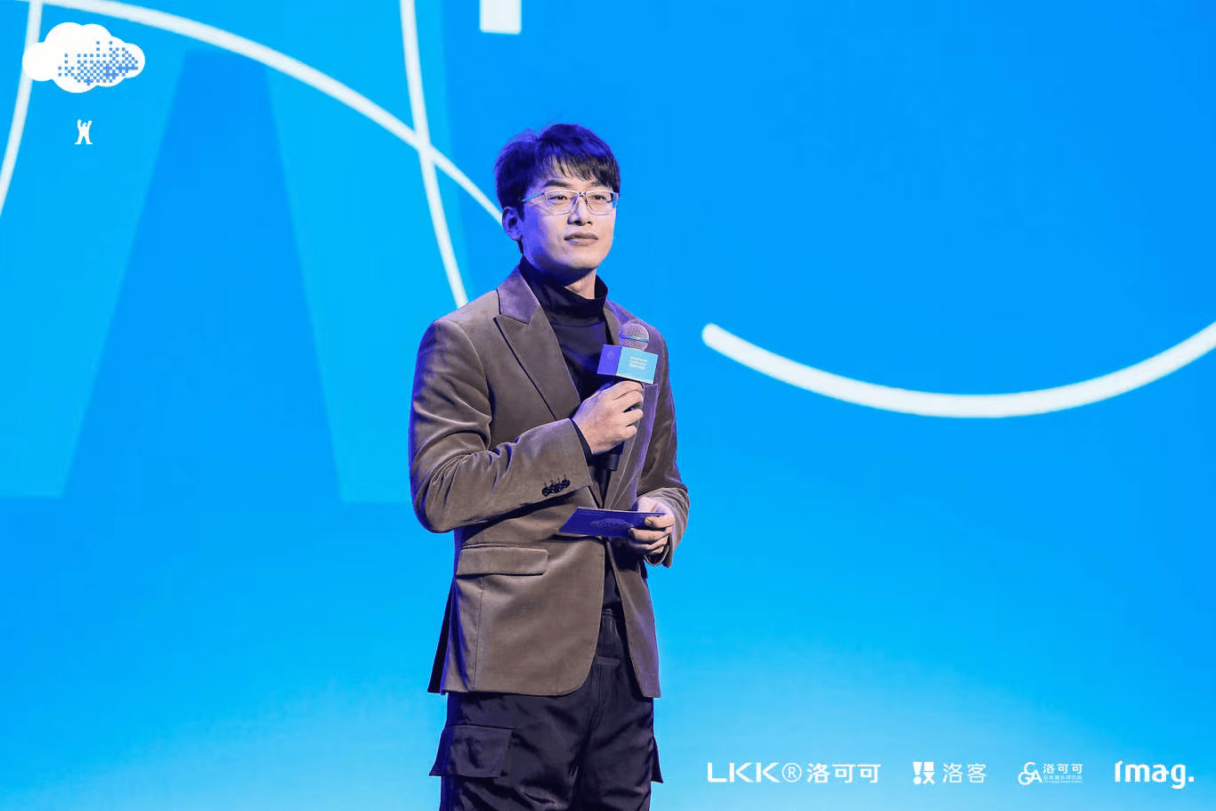洛可可创新设计集团合伙人、副总裁蔚江在大会开场解读主KV设计理念。创作源于对“想象力”本质的追问,摒弃往届宏大科技与商业风格,回归本真。核心创意取自“imagination”简写:截取“imagine”去“e”加圆点,简洁精巧。视觉灵感源自两大意象:一是大自然最具想象力的载体千变万化的云朵,象征想象力的自由与灵动;二是人类探索世界的本能——从火把到手电,用微光照亮未知的探索精神,呼应洛可可21年来以产品创新探索商业边界的初心。